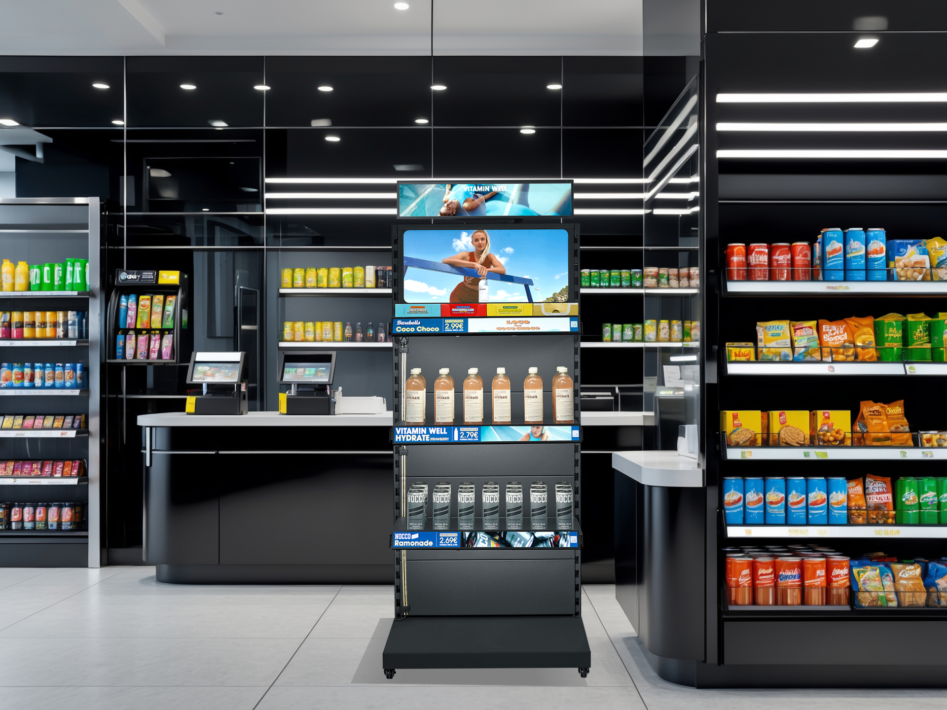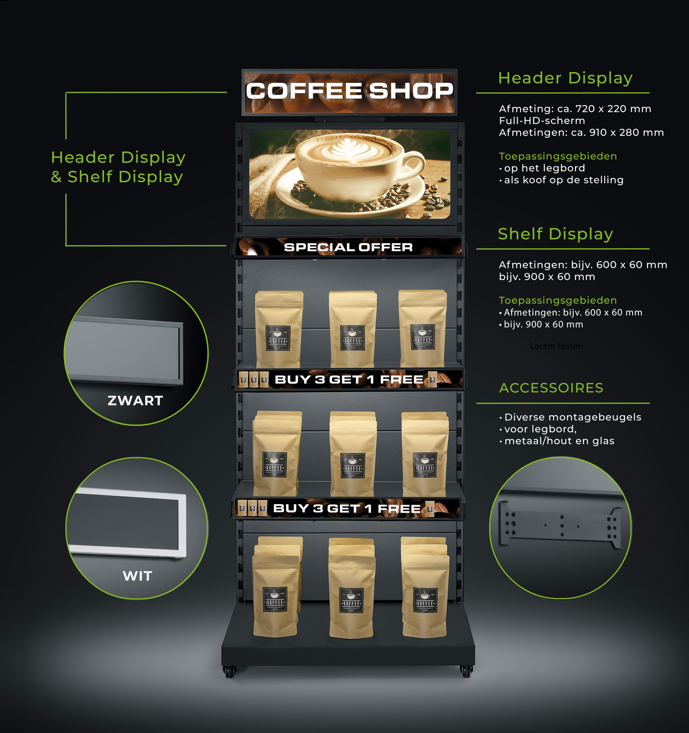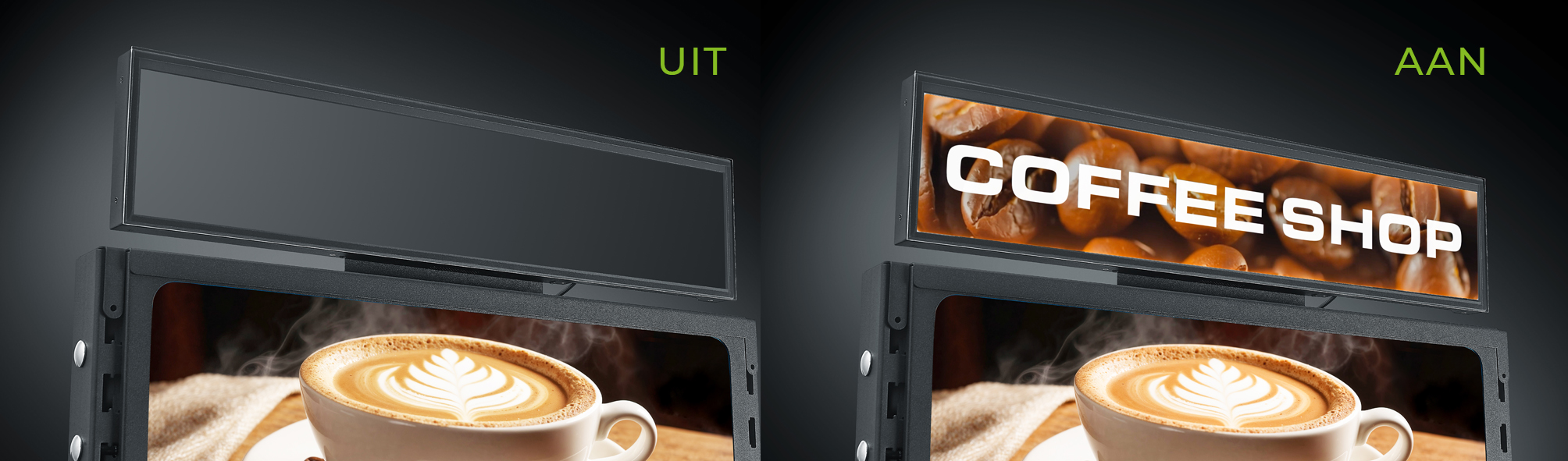 • Promo-video’s & animaties: Toon korte video’s, merkboodschappen of geanimeerde content direct aan het schap.